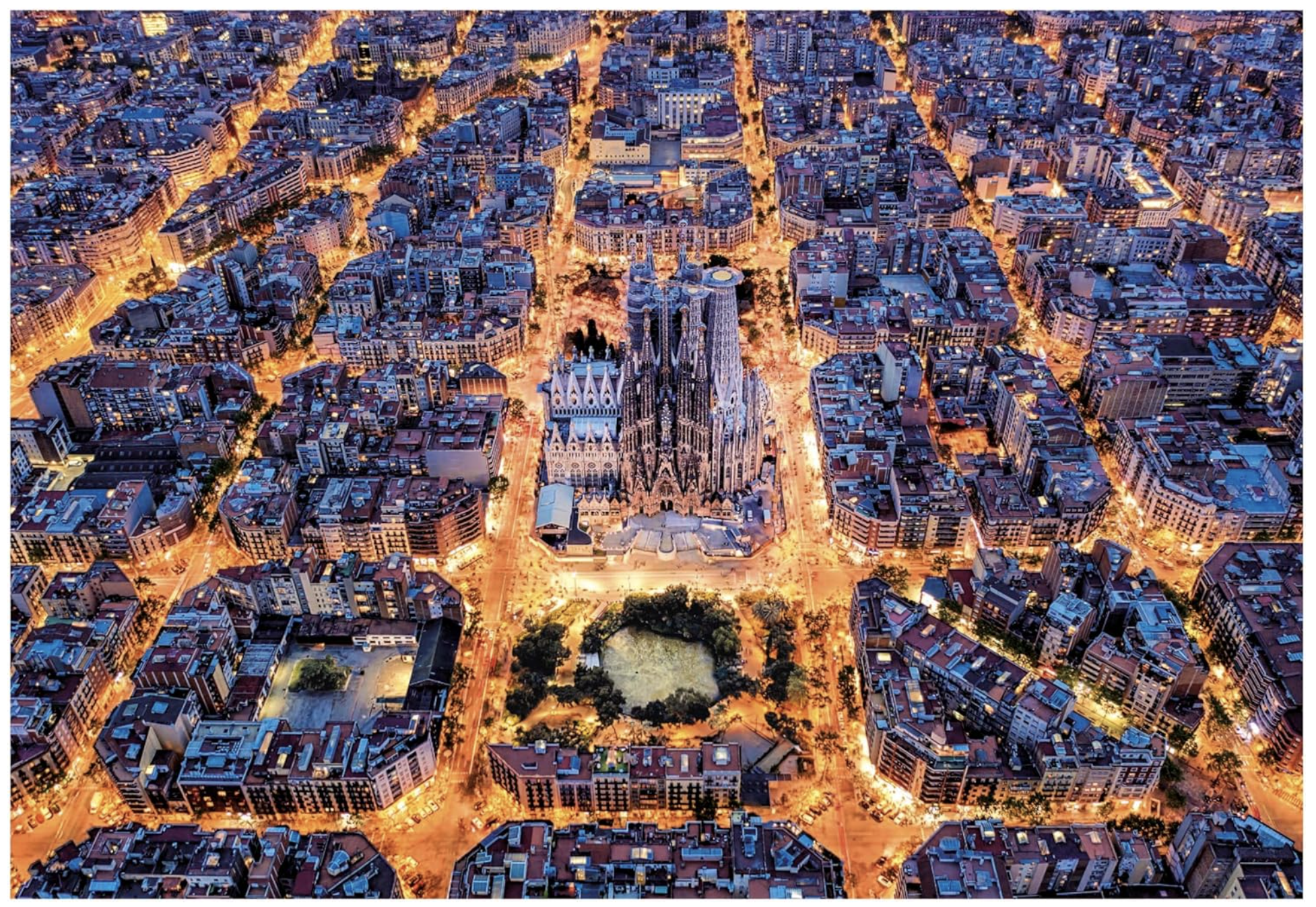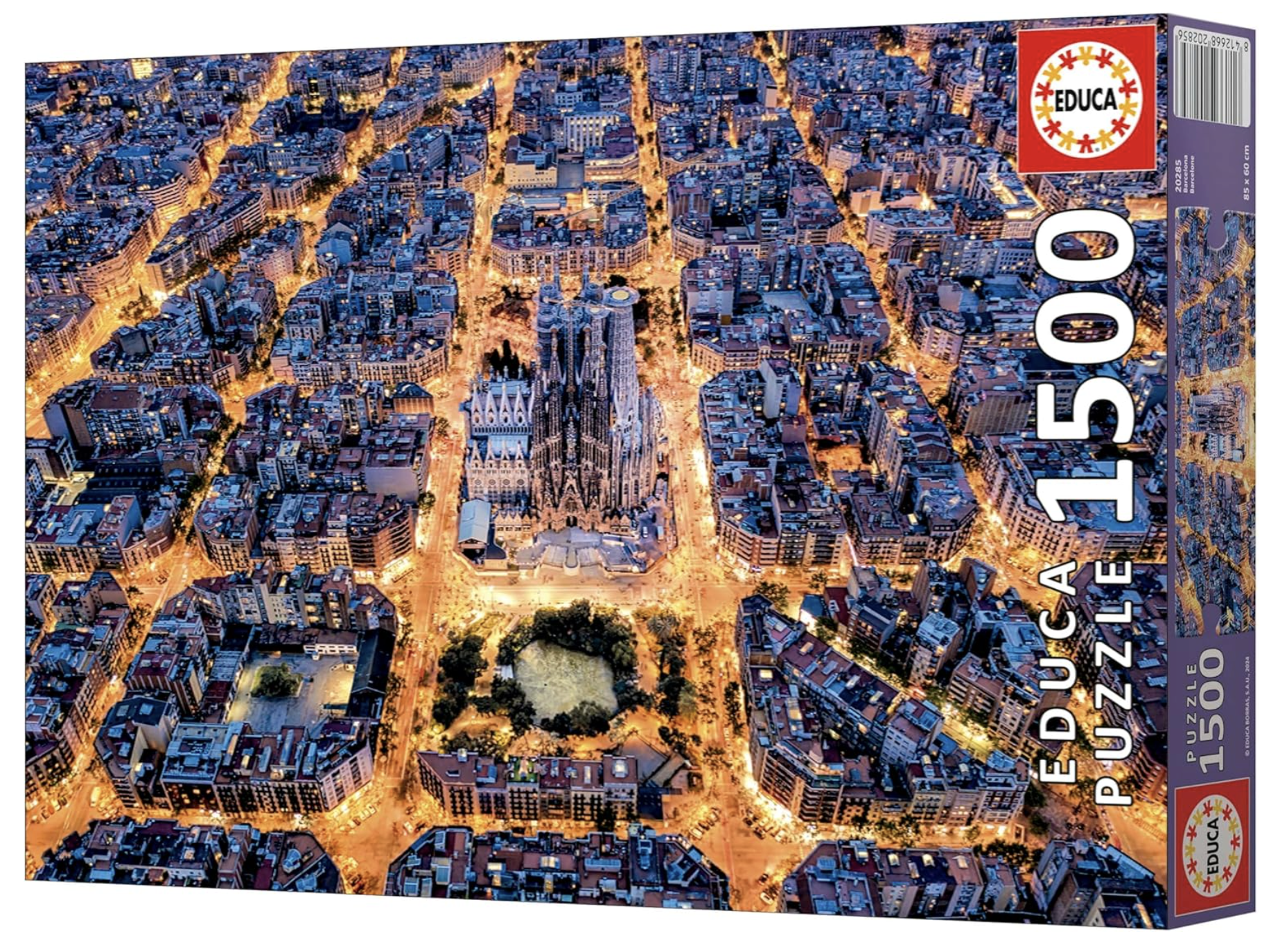 The typical street plan of Barcelona, beautifully lit during a lively night in the popular city in Spain. The Sagrada Familia is perfectly recognisable in the photo. Puzzle by Educa of 1500 pieces.