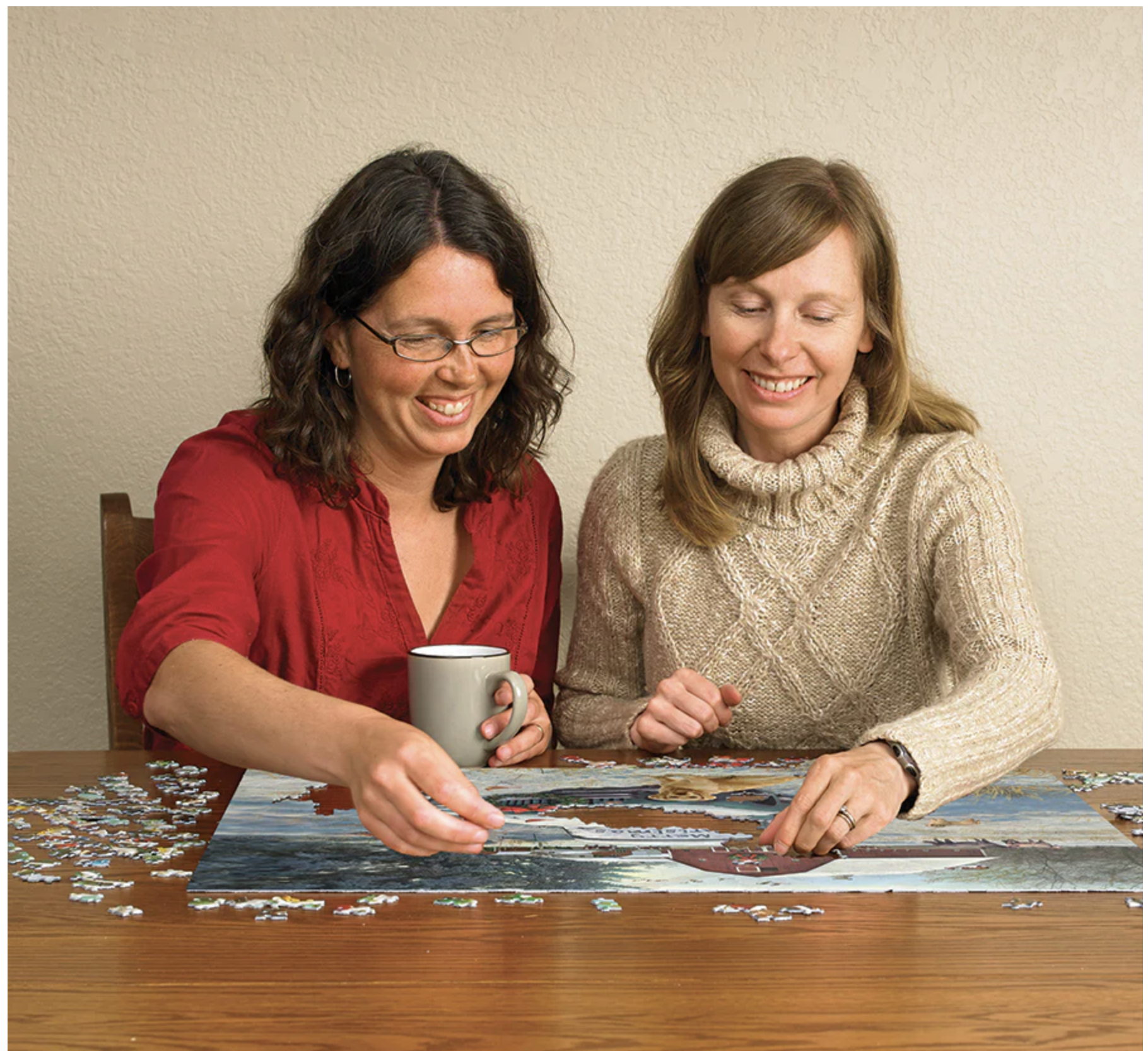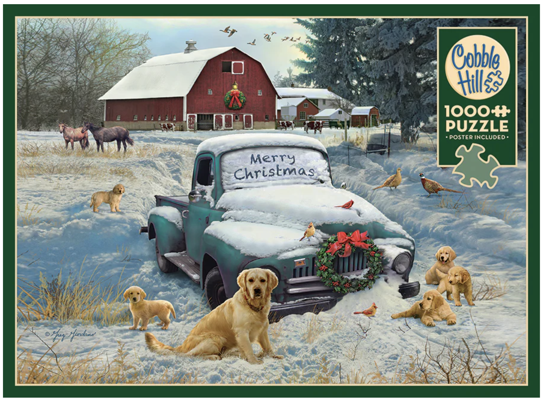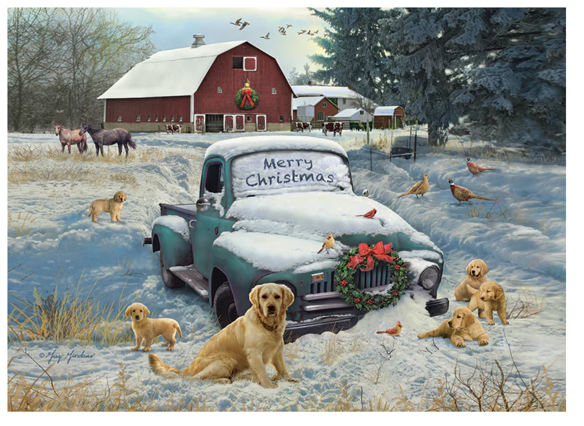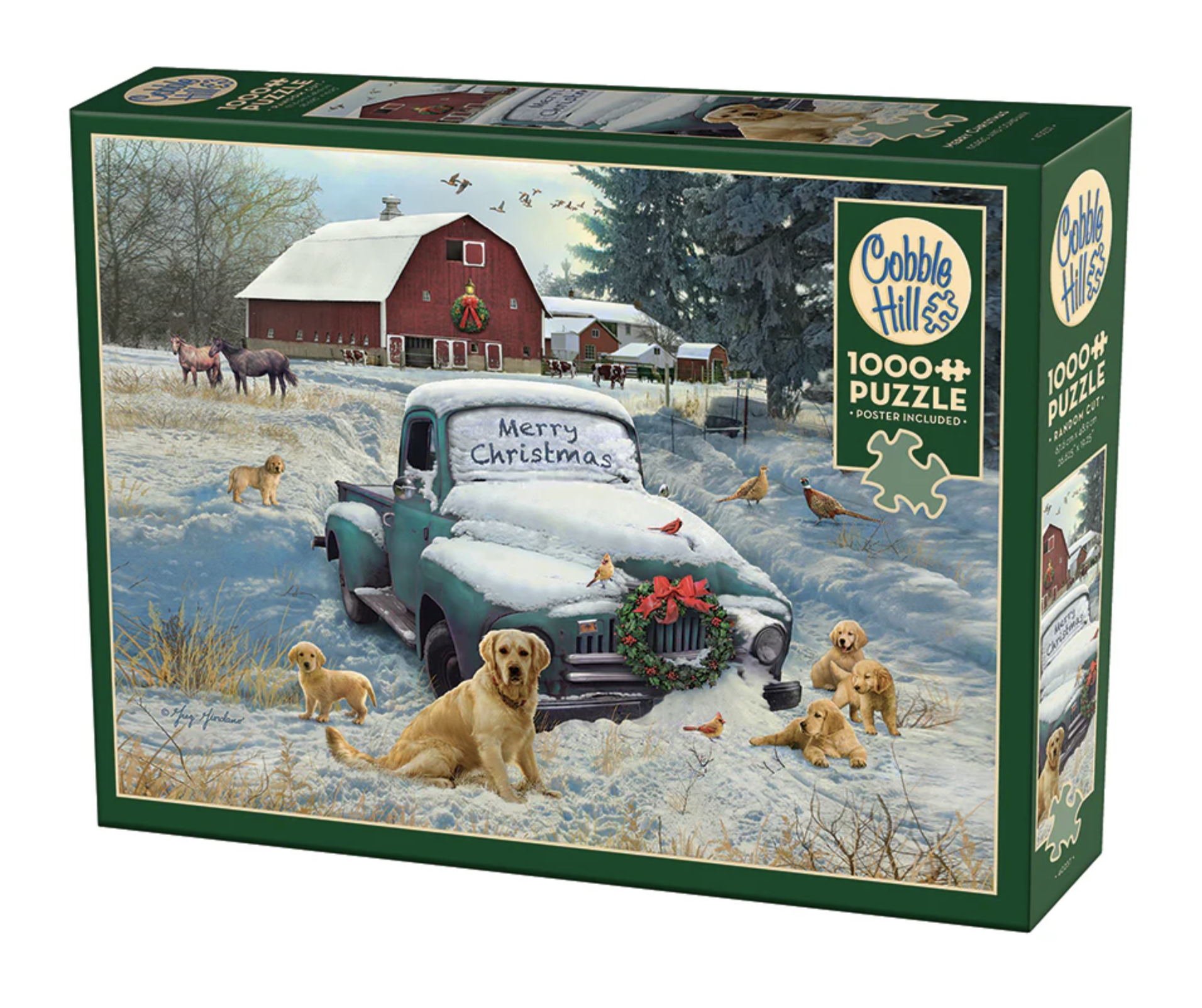 It's going to be a white Christmas on the farm! The pickup truck welcomes every visitor with an original Merry Christmas greeting. The Labrador family sees that it is good. High-quality Cobble Hill jigsaw puzzle with 1000 pieces.
