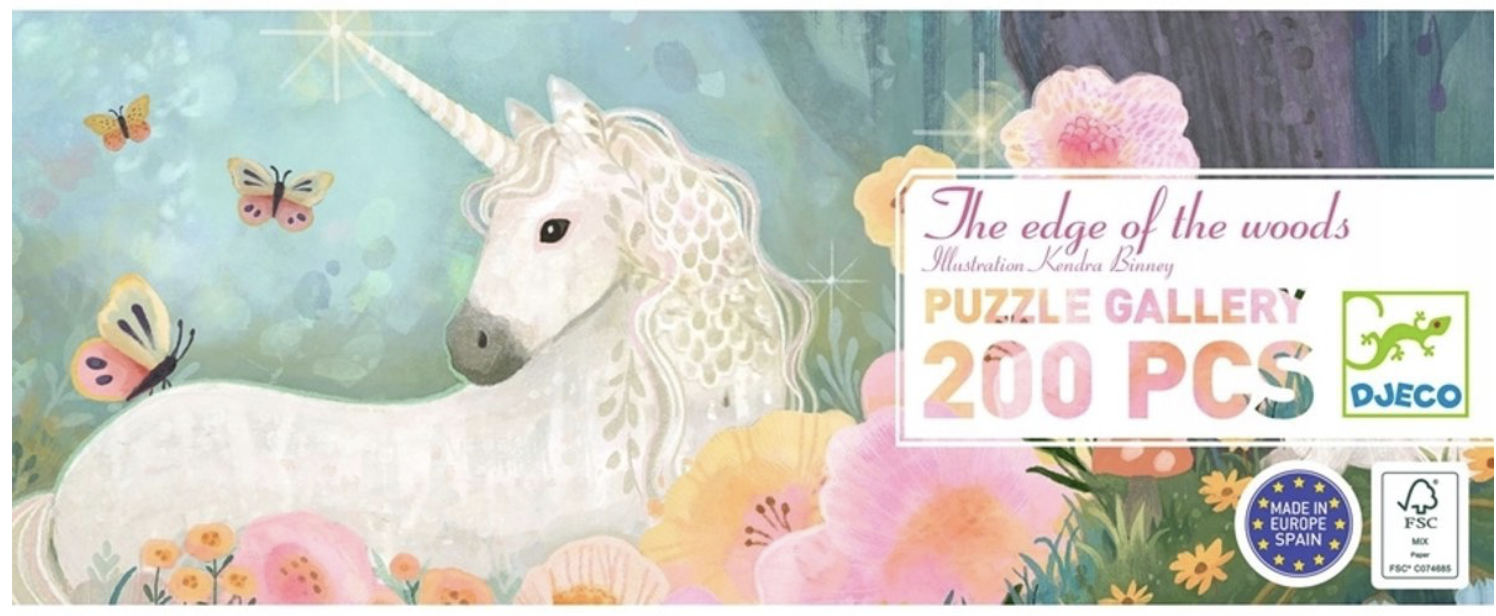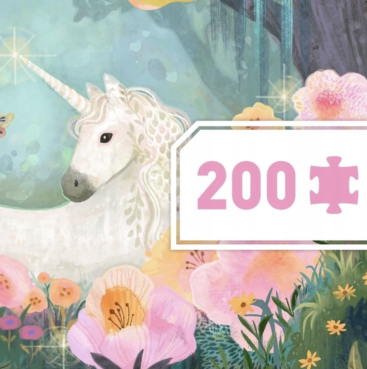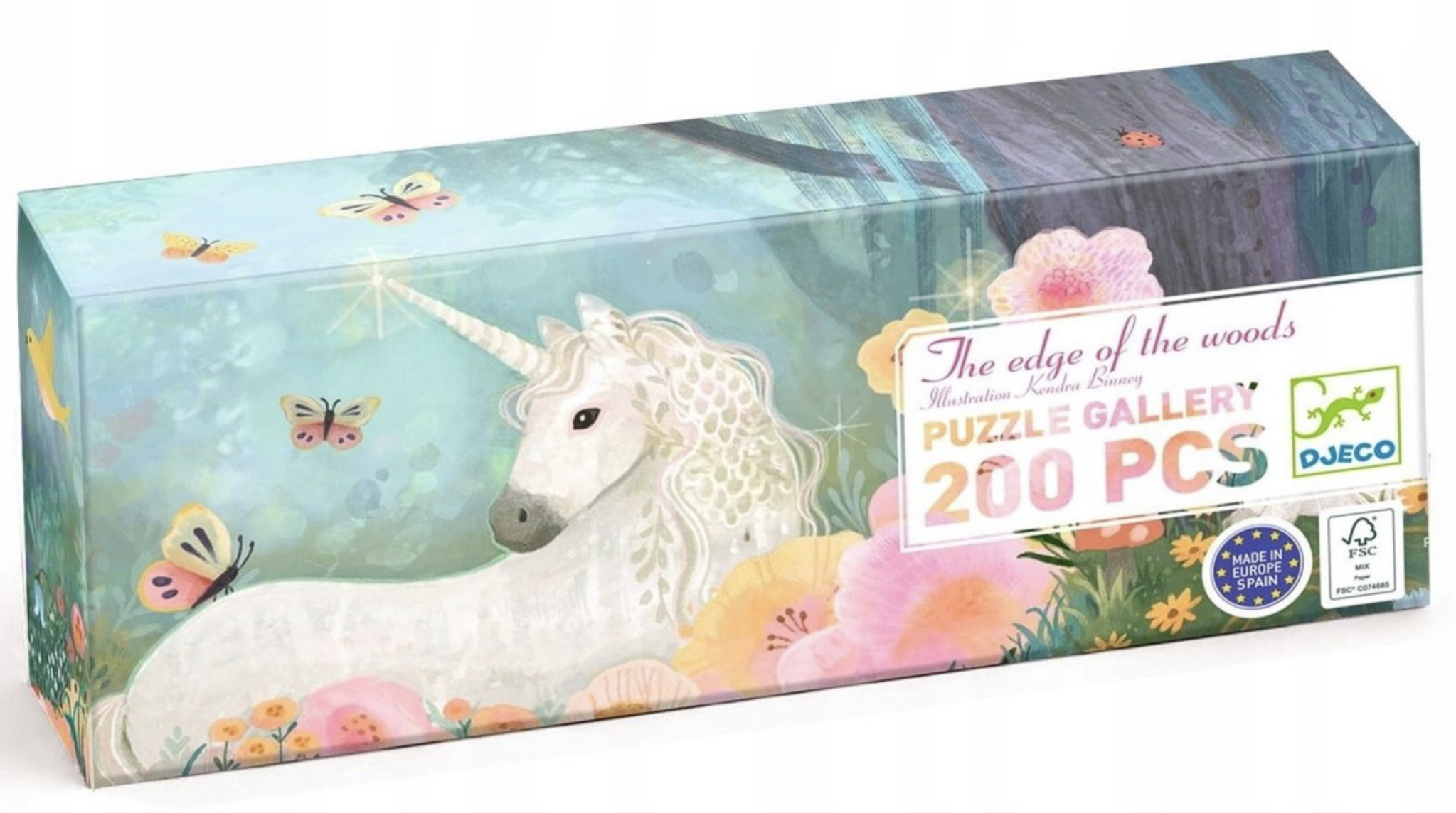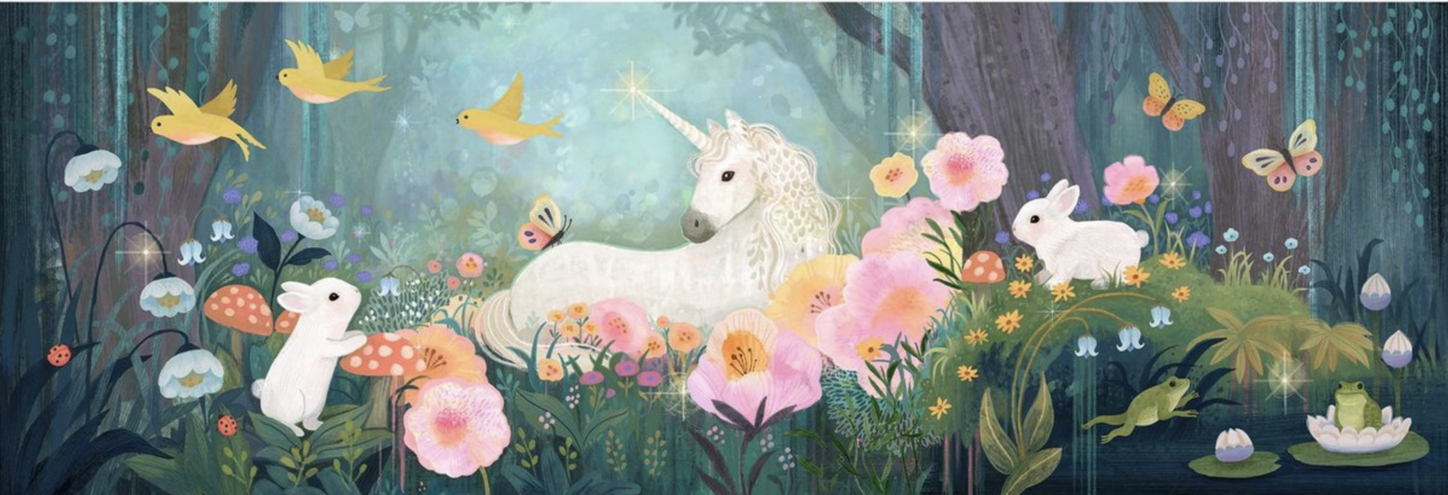 The unicorn lies peacefully in this enchanted forest. Beautiful panoramic puzzle with 200 pieces.