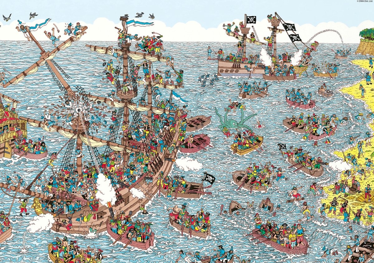 After completing the puzzle, go searching for Wally, his 4 fellow travellers and their belongings with the pirates!