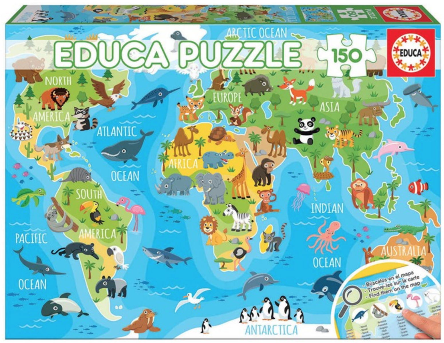 Fun and instructive puzzle with a drawn world map. Recognize the animals and learn where they live anywhere in the world! Qualitative puzzle of Educa of 150 pieces.