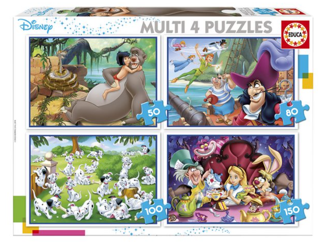 4 puzzles progressifs des personnages classiques de Disney - Aladdin, Le Livre de la Jungle, 101 Dalmatiens et Peter Pan - dans une grande boîte.
