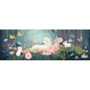 La licorne repose paisiblement dans cette forêt enchantée. Magnifique puzzle panoramique de 200 pièces.