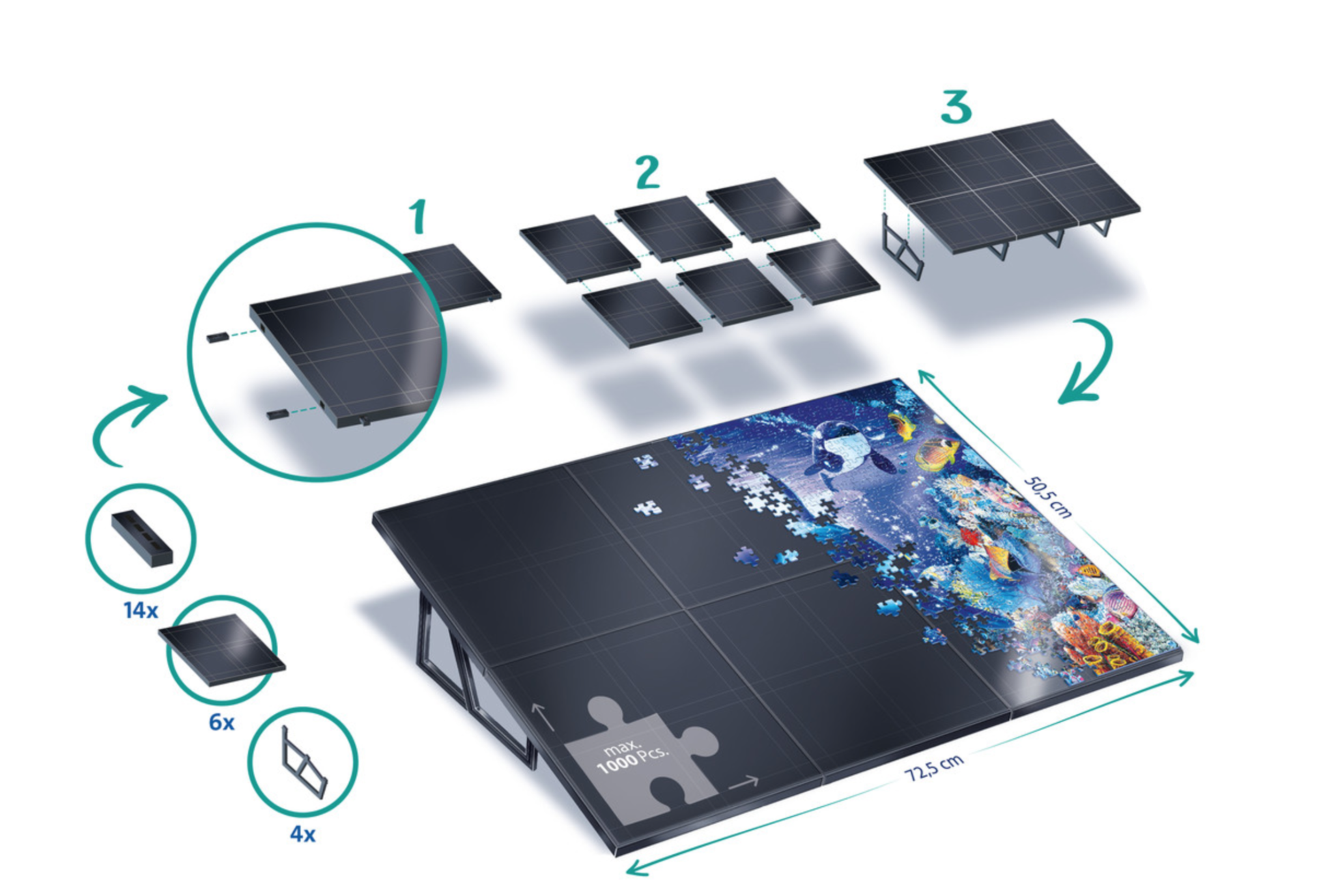 Haal de 24 onderdelen uit de doos en zet je puzzelbord in elkaar. Het puzzelbord staat altijd op éénzelfde kaneelstand. Het puzzelbord is voor 98% gemaakt van gerecycleerd materiaal. Past perfect voor een puzzel van 1000 stukjes in liggend formaat.