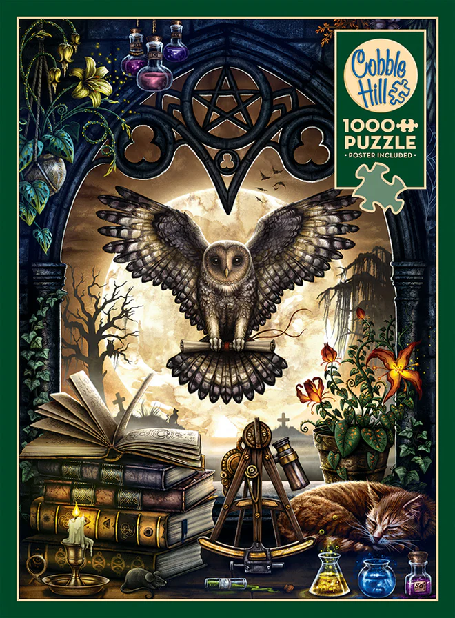 Een open raam omlijst een maanverlichte nacht, waardoor een mystieke uil een briefje van een mysterieuze afzender bezorgt in “The Summons”. Vlakbij werpt een flikkerende kaars een mysterieus licht op de vraag waar de eigenaar zich bevindt.
